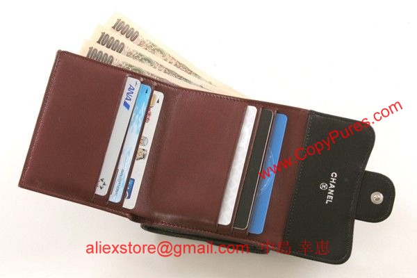 【シャネル】【二つ折財布】【新品】クロス模様がエレガントなオーラを放ちます。両面同じデザインはありそうでなかった。片側は仕切りつきの大きく開く小銭入れ。片側は二つ折で開くとお札入れ×1とカード入れ×6が付いて 「ます。実用性にも優れた優秀アイテム。/商品番号:31507/カラー:ブラック(NOIR BORDE)/素材:カーフレザー/ 【縦】×【横】×【厚さ】/ 約9cm×10cm×4cm