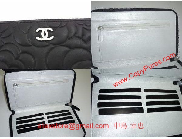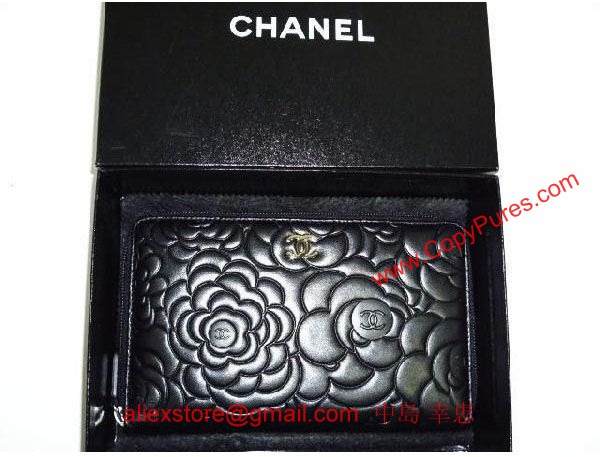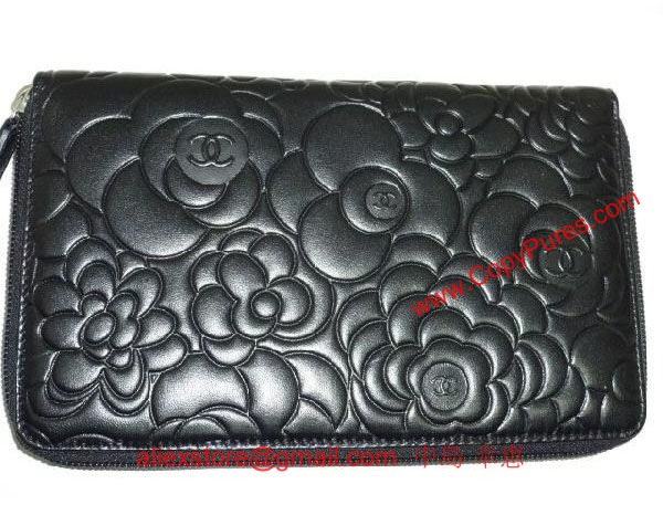 【シャネル】【長財布】 A36543カメリアエンボス革 ジップウオレット 黒/シルバー