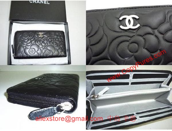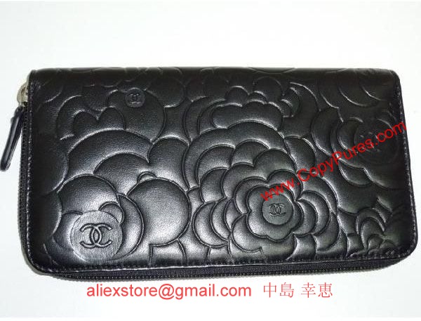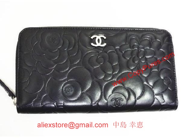 【シャネル】【長財布】 A46418カメリアエンボス ジップウオレット小 黒/シルバー