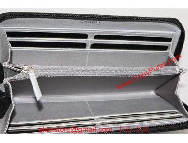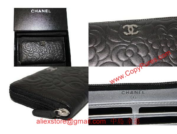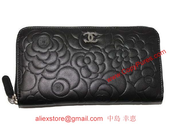 シャネル A50085 カメリアエンボス ジップウオレット 黒/SV ラウンドファスナー長財布