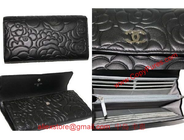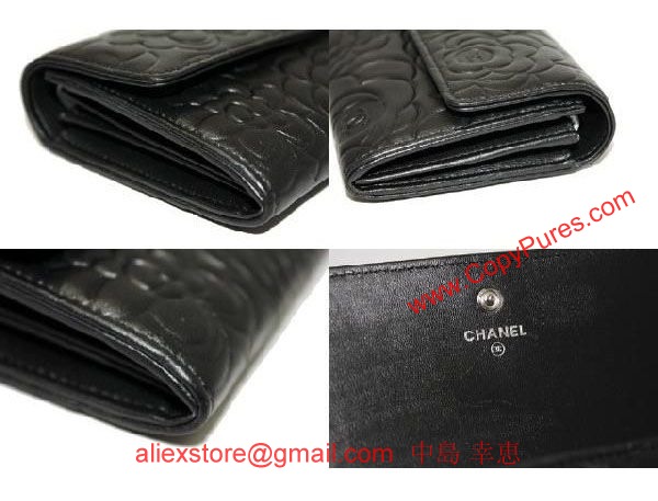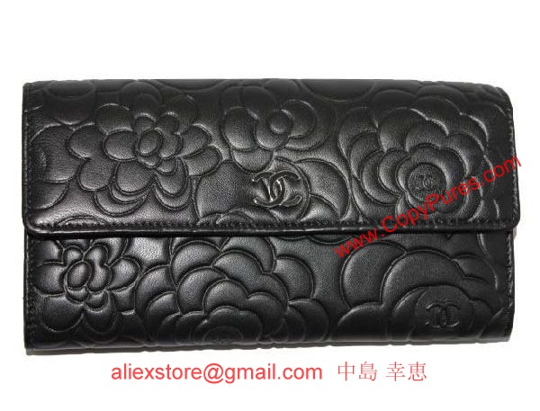 シャネル カメリアエンボス ロングウオレット 黒/グレー ホック付きフラップ中央ファスナー長財布 AS2784