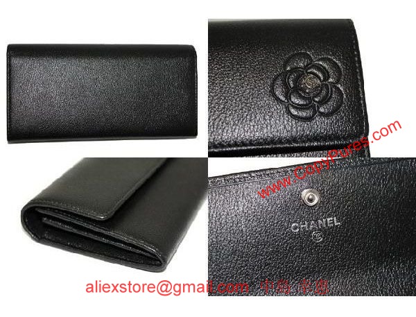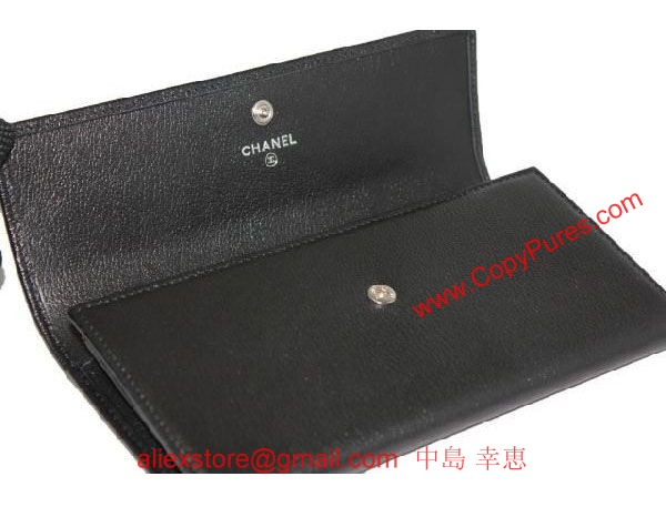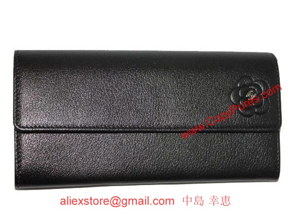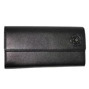 シャネル CCメタル付きカメリア型押し革ロングウオレット 黒 ホック付きフラップ中央ファスナー長財布 ASD635