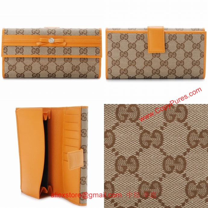 GUCCI/グッチ MAYFAIR長財布(ベージュ/オレンジ)。定番人気のGG柄キャンバス地にレザーのトリムとウェブリボンがキュートでスタイリッシュなおサイフです。