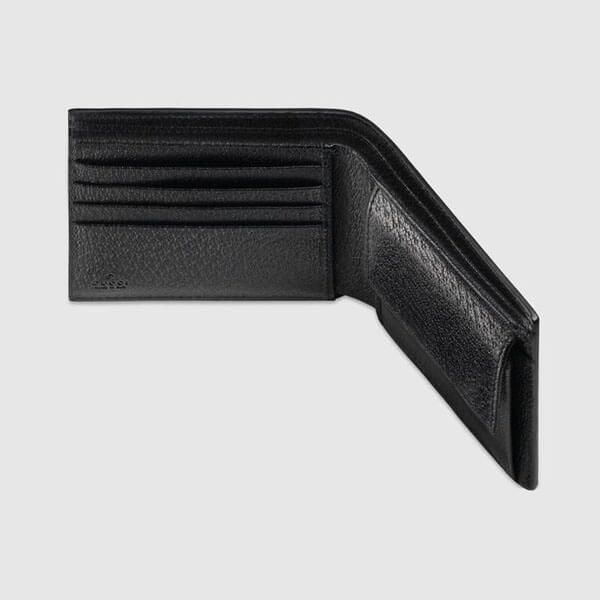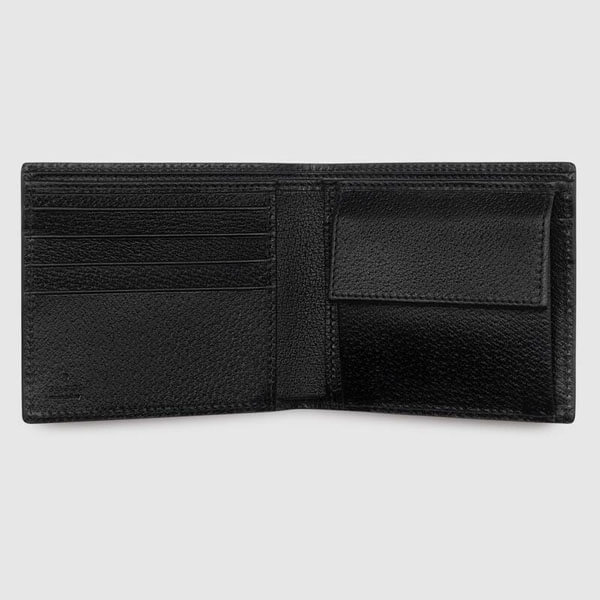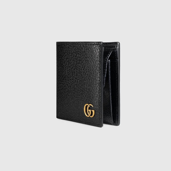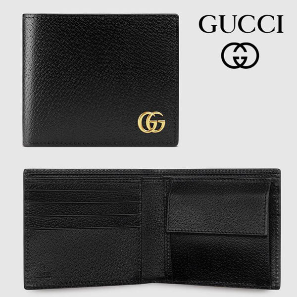 グッチを象徴するダブルG ハードウェアが存在感を放つバイフォルド コインウォレット。カーフスキンレザーにホットスタンプを施し、独特の質感を演出しています。