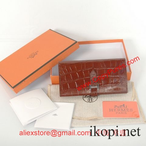 エルメスコピー 長財布 ベアンスフレ マチ有り ブラウン×シルバー金具 アリゲーターマット  hermeswallet31