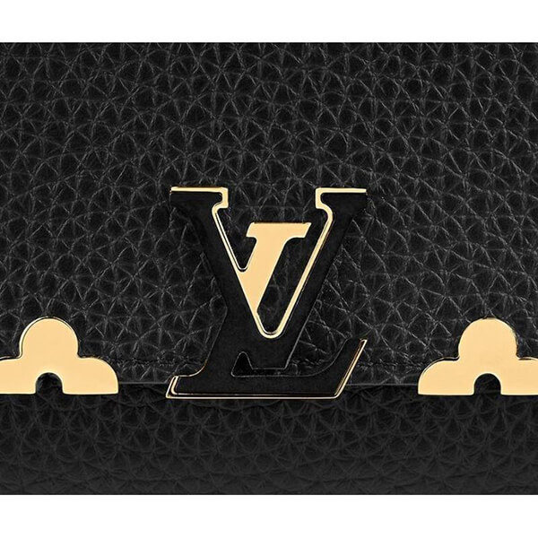 ゴールドカラーのモチーフが、グレインレザーのフラップを際立たせます。